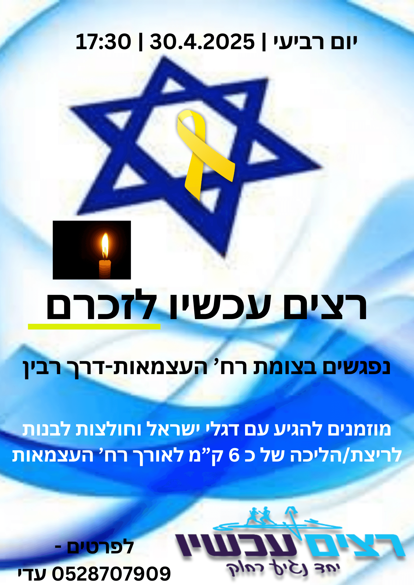 רצים.ות לזכרם.ן רעננה ביום רביעי 30/04 נקיים יחד ריצת זיכרון מרגשת ומאחדת במספר מוקדים בעיר. בואו לצעוד יחד - לזכור, לכבד ולא לשכוח. מוקדי ושעות התכנסות לריצה: בניין העירייה אחוזה 103 07:00 - לפרטים ששי דניאל 052-2318342 פארק רעננה רחבת הגלגיליות בשיתוף "5 אצבעות" 17:30 - לפרטים ליר גולן 052-6295325 רחבת יד לבנים אחוזה 147 17:30 - לפרטים דודו 050-3003363 ספורטק נווה זמר סשה ארגוב 38 17:30 - לפרטים רז 054-7000015 בית ספר שקד יאיר שטרן (בכניסה) 17:30 - לפרטים רוני קדם 052-7444770